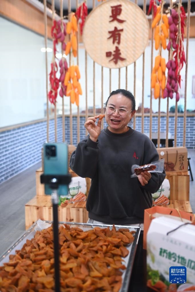11月23日,黨員志愿者在浙江省建德市更樓街道橋嶺村共富工坊的直播間里進(jìn)行網(wǎng)上直播銷售地瓜干。新華社記者 徐昱 攝