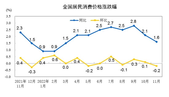國家統(tǒng)計局今日發(fā)布數(shù)據(jù)顯示,2022年11月份,全國居民消費價格同比上漲1.6%。其中,城市上漲1.5%,農(nóng)村上漲1.7%;食品價格上漲3.7%,非食品價格上漲1.1%;消費品價格上漲2.3%,服務價格上漲0.5%。1-11月平均,全國居民消費價格比上年同期上漲2.0%。
