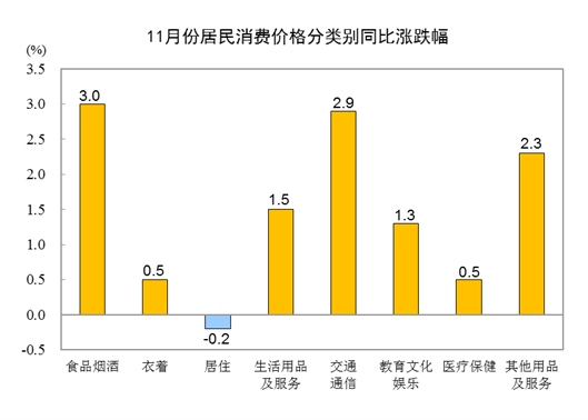 11月份,全國居民消費價格環(huán)比下降0.2%。其中,城市下降0.2%,農(nóng)村下降0.2%;食品價格下降0.8%,非食品價格持平;消費品價格下降0.1%,服務價格下降0.2%。