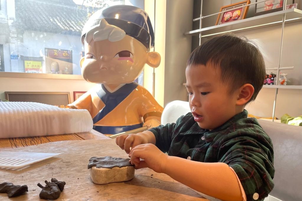 一名兒童在家長(zhǎng)陪同下在泥人咖啡館捏泥人。新華社記者 朱國亮 攝