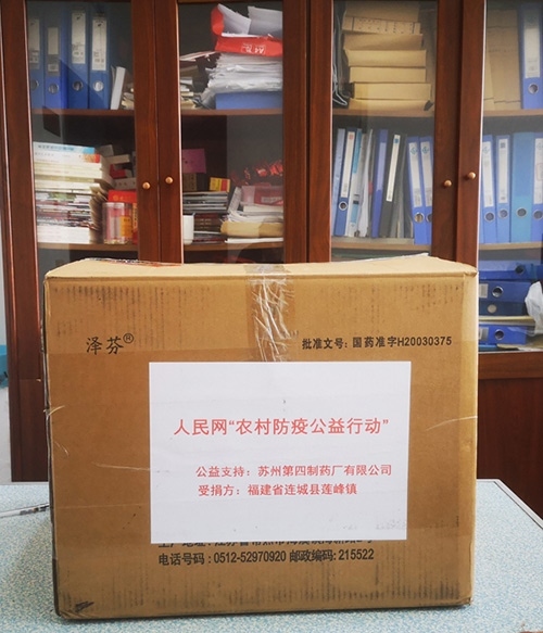 福建省連城縣蓮峰鎮(zhèn)收到蘇州第四制藥廠通過人民網(wǎng)“防疫互助平臺”捐贈(zèng)的右布洛芬膠囊。曾金水?dāng)z