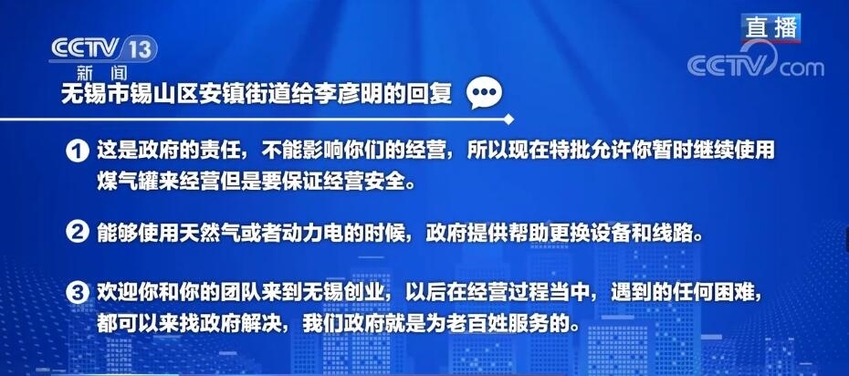 白巖松:首先我們來看看安鎮(zhèn)街道給李彥明的回復當中的一些關鍵詞,第一個,這是政府的責任,不能影響你們的經(jīng)營。第二個里頭包括能夠使用天然氣或者動力電的時候,政府提供幫助更換設備和線路。在第三里頭有我們政府就是為老百姓服務的。咱們接下來馬上連線一下當事人,無錫市錫山區(qū)安鎮(zhèn)街道商務科的科長鄒祎,就是他幫著辦的這個事情。鄒科長您好!您當然感受得到您火了,在網(wǎng)上也被網(wǎng)友表揚,我特別想知道您的領導表揚您沒有?
