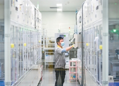 2023年2月8日,在江西省贛州市孚能科技(贛州)有限公司全自動(dòng)新能源軟包動(dòng)力電池生產(chǎn)線上,工人正在操控設(shè)備趕制訂單產(chǎn)品。胡江濤攝(人民圖片)