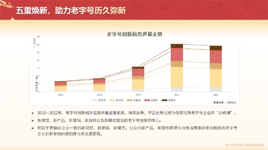 《報告》基于近五年傳播與實體數(shù)據(jù)信息,綜合運用全量及抽樣分析方法,洞察老字號五大創(chuàng)新發(fā)展趨勢,分析老字號在創(chuàng)新過程中暴露出的不足,并提出針對性建議舉措。