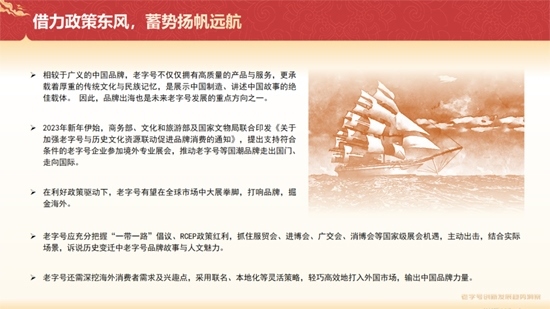 《報告》提到,在利好政策驅(qū)動下,老字號有望在全球市場中大展拳腳,打響品牌,掘金海外。具體來看,老字號應(yīng)充分把握“一帶一路”倡議、RCEP政策紅利,抓住國家級展會機(jī)遇,主動出擊,結(jié)合實際場景,訴說歷史變遷中老字號品牌故事與人文魅力。