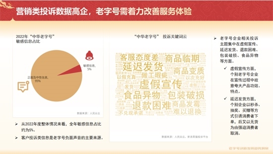 《報告》同時指出,在消費者側(cè),客戶投訴類信息是老字號負(fù)面聲音的主要來源,老字號企業(yè)相關(guān)投訴主題集中在虛假宣傳、延遲發(fā)貨、退款困難、包裝破損、食品異物等方面。這些問題不僅影響了消費者體驗,也不利于企業(yè)自身保持優(yōu)質(zhì)的聲譽(yù)形象。