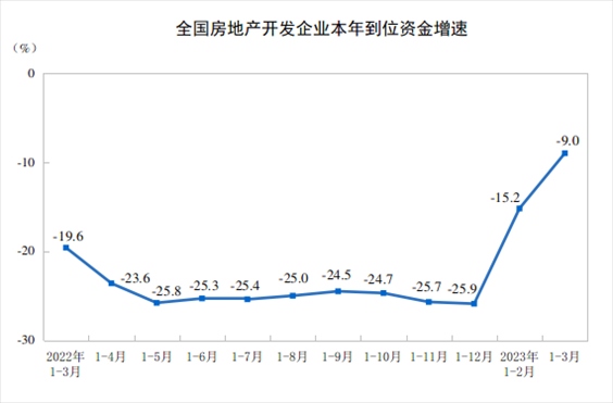 1—3月份,房地產開發(fā)企業(yè)到位資金34708億元,同比下降9.0%。其中,國內貸款4995億元,下降9.6%;利用外資8億元,下降22.7%;自籌資金10171億元,下降17.9%;定金及預收款11909億元,下降2.8%;個人按揭貸款6188億元,下降2.9%。