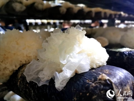 在福建省寧德市古田縣大橋鎮(zhèn)的一處標(biāo)準(zhǔn)化銀耳菇房,一個個整齊排列的架子上,培養(yǎng)基中長出一朵朵晶瑩的“白花”。由于銀耳需要避光、溫暖的生長環(huán)境,溫控智能化設(shè)備通過霧化、控溫等多項功能,模擬出銀耳在野生環(huán)境的生長條件。