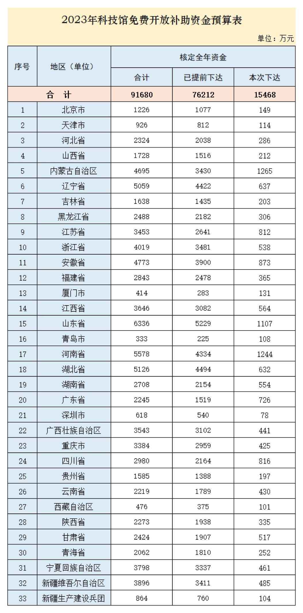 人民網(wǎng)北京5月10日電 (記者任妍)記者從財政部獲悉,為保障免費開放科技館正常運轉(zhuǎn),經(jīng)研究,現(xiàn)下達2023年科技館免費開放補助資金預(yù)算,統(tǒng)籌用于各?。▍^(qū)、市)及新疆生產(chǎn)建設(shè)兵團2023年免費開放科技館門票減收補助、運行保障增量補助及展品更新補助等方面。數(shù)據(jù)顯示,全國核定預(yù)算91680萬元,提前下達76212萬元,此次下達15468萬元。