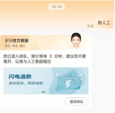 現(xiàn)實中,智能客服的出現(xiàn)的確提供了諸多便利,但當智能客服的標準化應答無法解決遇到的具體問題時,更多用戶便轉(zhuǎn)向人工客服。然而,人工客服的接通率較低。有網(wǎng)友反映,即便通過排隊接入人工客服,有時為了提交信息退出聊天窗口后,又需重新排隊進入,而此時,人工客服已換人,之前提出的問題也需要重復表述。