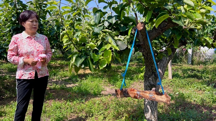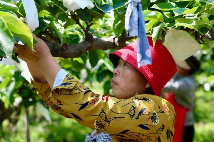 附近村民在梨園里實現就業(yè)。初夏時節(jié),村民給剛長出的小梨“穿衣裳”。