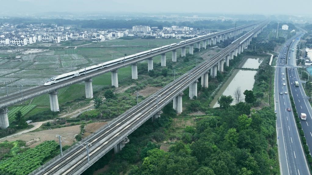 6月4日,從安徽省黃山市開(kāi)往浙江省杭州市的列車從黃山北站駛出。新華社發(fā)(樊成柱 攝)