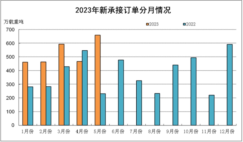 2023年1-5月新承接訂單分月統(tǒng)計(jì)。 來源:中國(guó)船舶工業(yè)行業(yè)協(xié)會(huì)