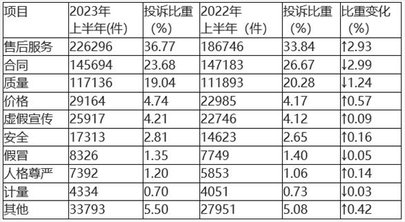 與2022年上半年相比(如表1所示),售后服務、價格問題投訴比重上升較多,合同、質量問題投訴比重下降明顯,其余類投訴變化幅度較小。