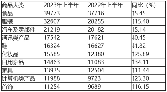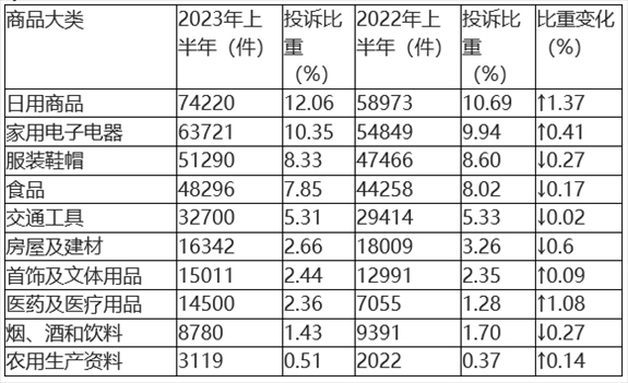 根據2023年上半年商品大類投訴數據(如圖2、表2所示),日用商品類、家用電子電器類、服裝鞋帽類、食品類和交通工具類投訴量居前五位。與2022年上半年相比,日用商品類、醫(yī)藥及醫(yī)療用品類投訴比重上升明顯,房屋及建材類投訴比重有所下降。