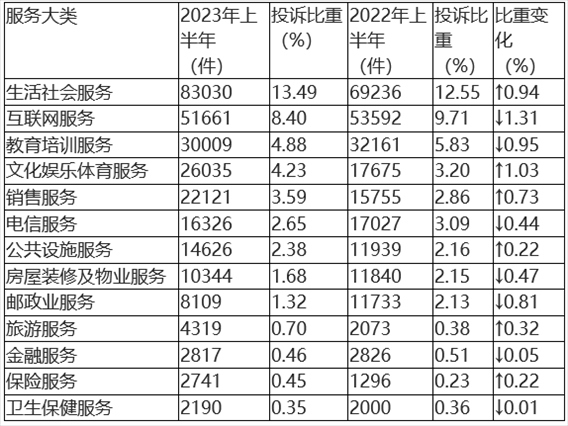 根據2023年上半年服務大類投訴數據(如圖3、表3所示),生活社會服務類、互聯網服務類、教育培訓服務類、文化娛樂體育服務類與銷售服務類居于服務類投訴量前五位。與2022年上半年相比,文化娛樂體育服務類、生活社會服務類投訴比重有所上升,互聯網服務類、教育培訓服務類投訴比重略有下降。