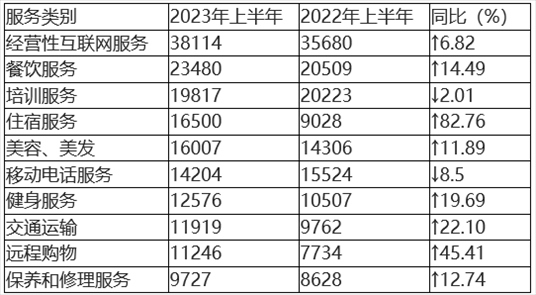 在具體服務投訴中,投訴量居前五位的分別為(如圖5、表5所示)經營性互聯網服務、餐飲服務、培訓服務、住宿服務、美容美發(fā)。與2022年上半年相比,住宿服務、遠程購物、保養(yǎng)和修理服務進入服務類投訴前十。其中,住宿服務、遠程購物投訴量同比顯著增長,移動電話服務投訴量同比有所下降。