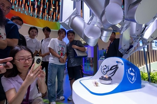 9月2日,在服務(wù)貿(mào)易及服務(wù)業(yè)擴(kuò)大開放成就展上,手術(shù)機(jī)器人吸引了眾多觀眾駐足。人民網(wǎng)記者 翁奇羽攝