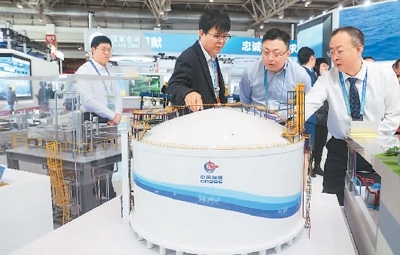 11月29日,在北京舉行的首屆中國(guó)國(guó)際供應(yīng)鏈促進(jìn)博覽會(huì)上,參觀者了解中海石油獨(dú)創(chuàng)的擁有自主知識(shí)產(chǎn)權(quán)的全容式液化天然氣(LNG)儲(chǔ)罐。陳曉根攝(人民視覺(jué))
