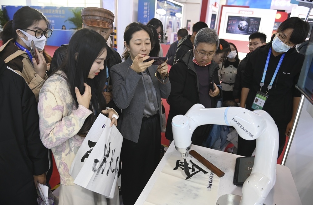 參觀者在首屆中國(guó)國(guó)際供應(yīng)鏈促進(jìn)博覽會(huì)數(shù)字科技鏈展區(qū)科大訊飛展位觀看一款A(yù)I書(shū)法機(jī)器人寫毛筆字(2023年12月2日攝)。新華社記者 蔡湘鑫 攝