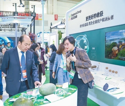 觀眾(左)在先正達(dá)集團(tuán)展臺(tái)參觀。本報(bào)記者 白真智攝