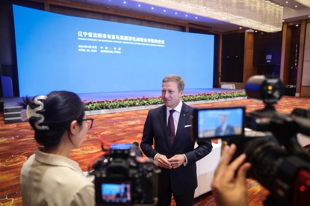 4月26日,寶馬集團董事長齊普策接受采訪。新華社記者 潘昱龍 攝