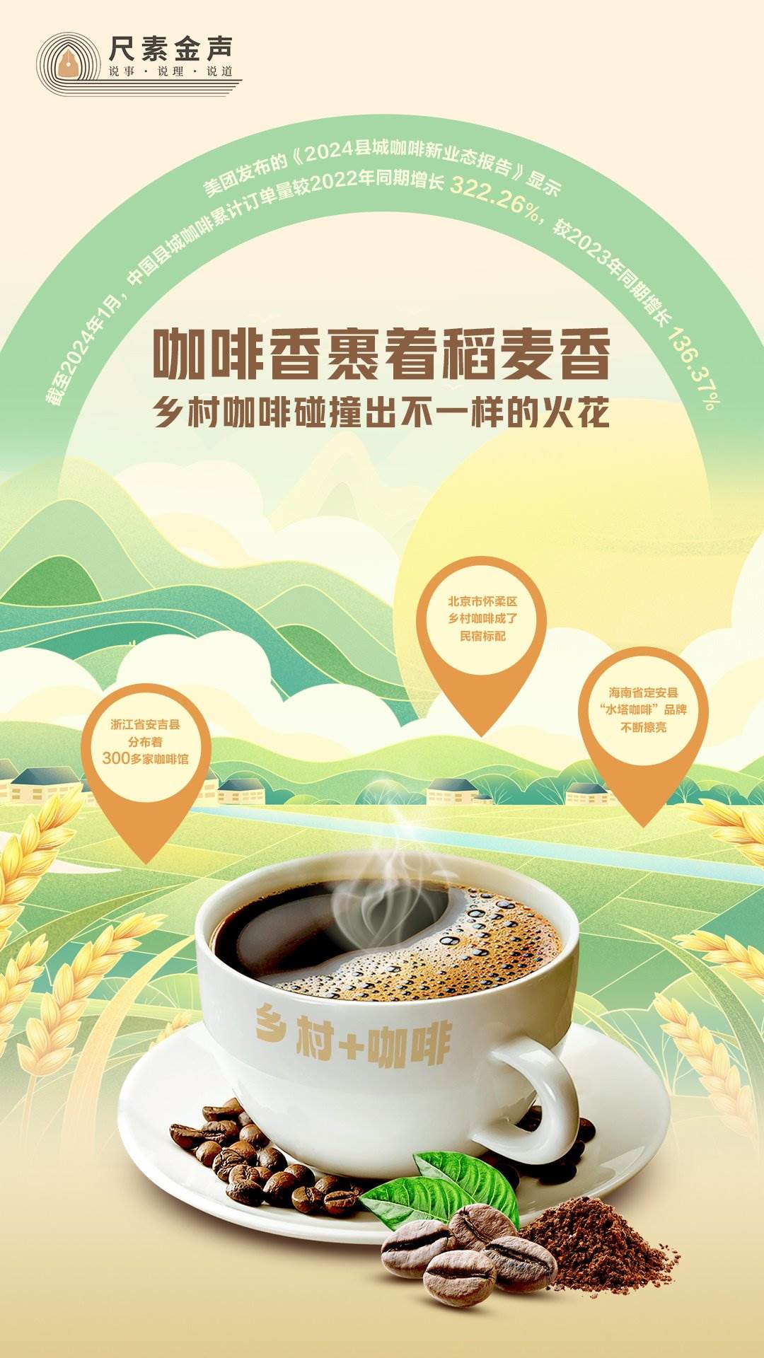 咖啡香裹著稻麥香,吹遍田野。“咖啡+”成為鄉(xiāng)村旅游新業(yè)態(tài)。美團發(fā)布的《2024縣城咖啡新業(yè)態(tài)報告》顯示,截至2024年1月,中國縣城咖啡累計訂單量較2022年同期增長322.26%,較2023年同期增長136.37%。鄉(xiāng)村咖啡火出圈,背后靠什么?
