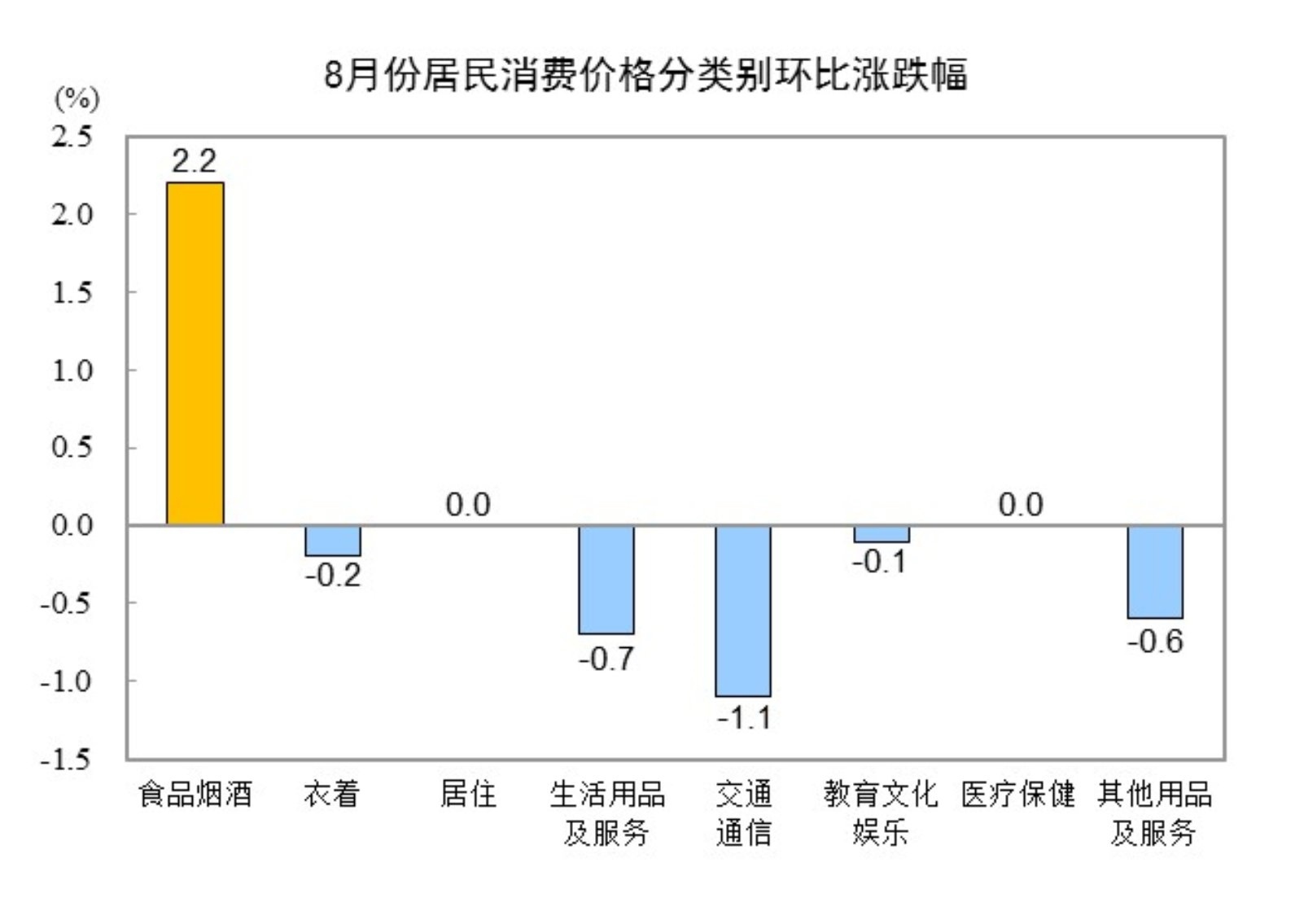 8月份,全國居民消費價格環(huán)比上漲0.4%。其中,城市上漲0.3%,農村上漲0.4%;食品價格上漲3.4%,非食品價格下降0.3%;消費品價格上漲0.7%,服務價格下降0.1%。