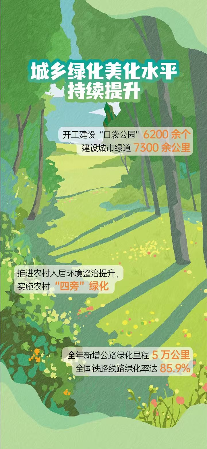 張利明介紹,過(guò)去一年,山水林田湖草沙系統(tǒng)治理取得新進(jìn)展,城鄉(xiāng)綠化美化水平持續(xù)提升。組織實(shí)施176個(gè)“雙重”工程項(xiàng)目、10個(gè)國(guó)土綠化示范項(xiàng)目。推進(jìn)實(shí)施“十四五”27個(gè)山水林田湖草沙一體化保護(hù)和修復(fù)工程項(xiàng)目、49個(gè)歷史遺留廢棄礦山生態(tài)修復(fù)示范工程項(xiàng)目。森林可持續(xù)經(jīng)營(yíng)實(shí)施面積擴(kuò)大到66.7萬(wàn)公頃以上。全國(guó)林草碳匯試點(diǎn)市(縣)和國(guó)有林場(chǎng)碳匯試點(diǎn)實(shí)施面積達(dá)6.8萬(wàn)公頃。新增水土流失治理面積6.4萬(wàn)平方公里。開(kāi)工建設(shè)“口袋公園”6200余個(gè),建設(shè)城市綠道7300余公里。新增公路綠化里程5萬(wàn)公里,全國(guó)鐵路線路綠化率達(dá)85.9%。