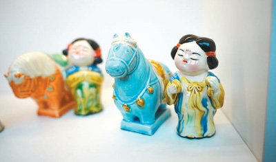 如今,唐三彩中常見(jiàn)的馬、駱駝等造型,形態(tài)更多元,顏色也更豐富。在洛陽(yáng)“鎮(zhèn)搗蛋”等文創(chuàng)店,憨態(tài)可掬的三彩小馬除了傳統(tǒng)配色,還有粉色、水藍(lán)色等符合年輕人審美的莫蘭迪色系。三彩小馬、三彩侍女俑的文創(chuàng)組合,成為不少游客的到店選擇。