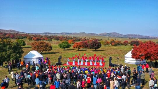 五角楓紅了,人們在來到這里載歌載舞慶豐收。梁永峰 攝