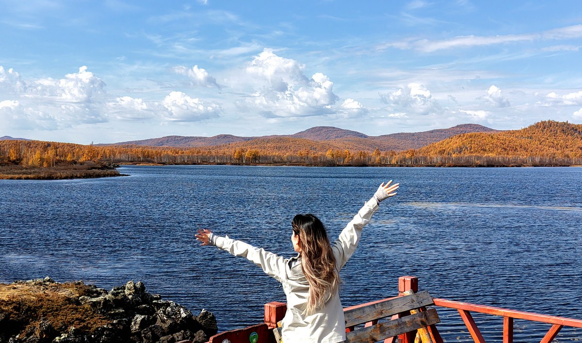 9月29日,游客在內(nèi)蒙古阿爾山國家森林公園烏蘇浪子湖邊打卡 北疆新聞記者 張楊攝影