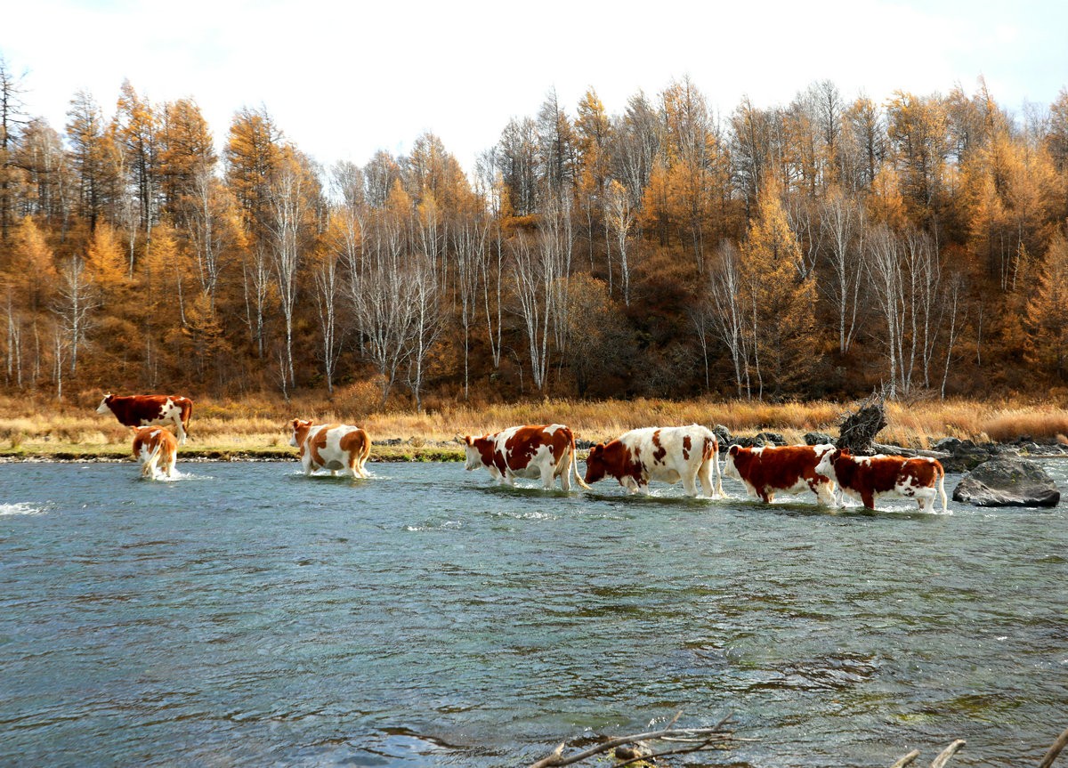 9月29日,內(nèi)蒙古阿爾山國家森林公園一群牛蹚過不凍河 北疆新聞記者 張楊攝影