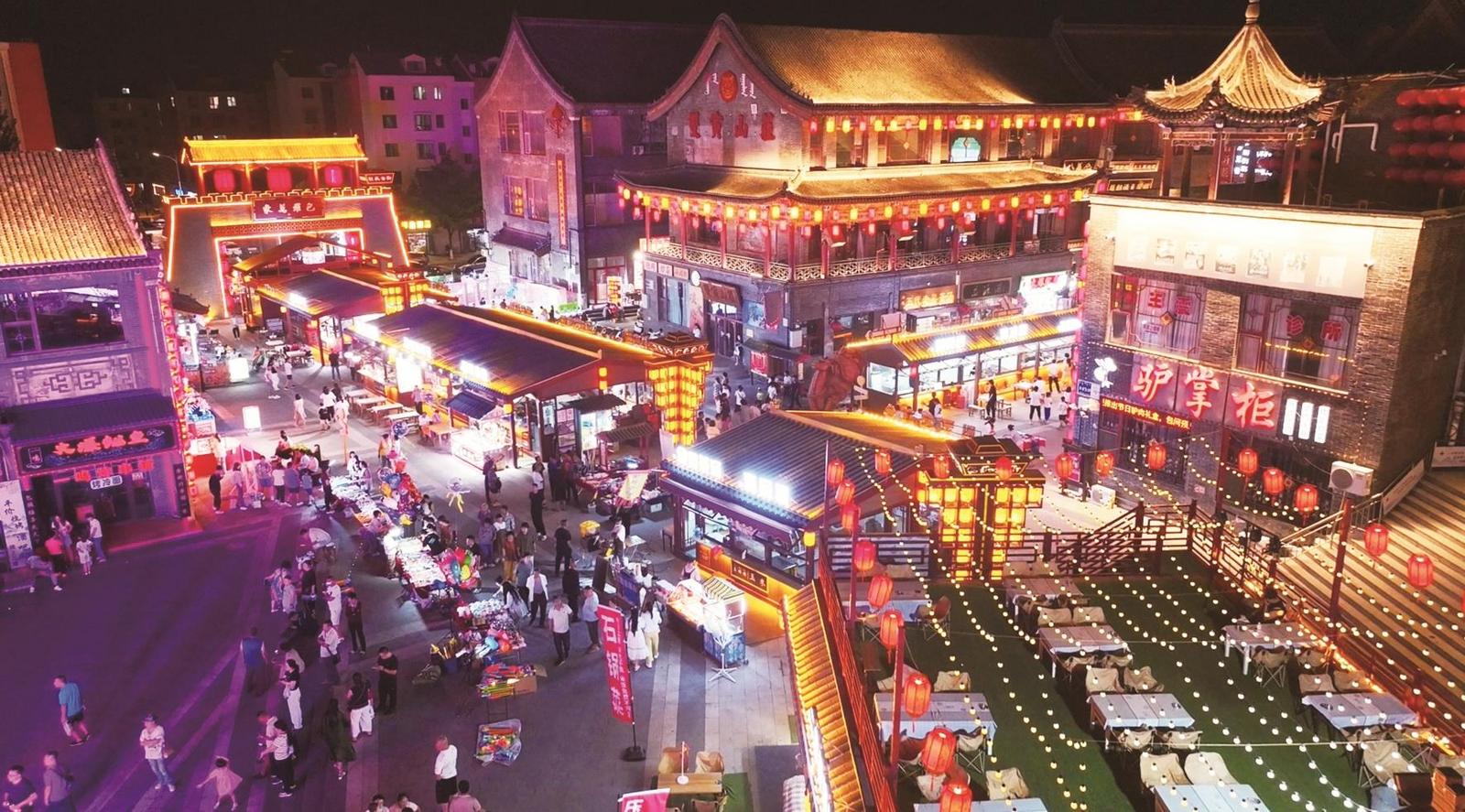 在這里,初秋是把煙火氣熬得更濃,晚風(fēng)卷著吆喝,把平凡日子燉成滾燙的歡喜,每一步都踩著熱鬧,每一眼都藏著舍不得溜走的夏天。飛檐翹角的建筑上,紅燈籠與黃串燈織就光網(wǎng)。穿漢服的人倚欄,晚風(fēng)裹著小吃香,把夏日余溫,釀成這古街獨有的浪漫。(祝家樂)