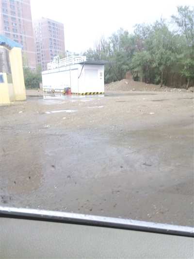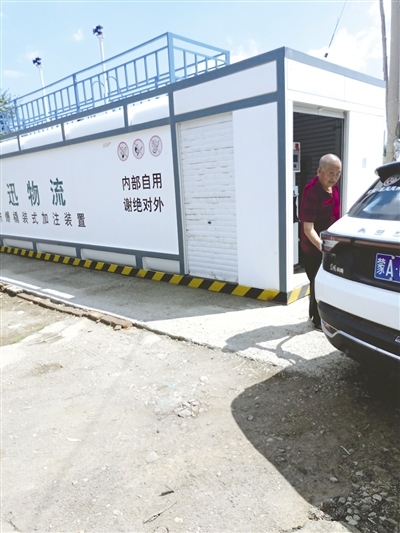 6月29日16時(shí)許,記者來到回民區(qū)塞外安康新居小區(qū)。該小區(qū)旁邊是一處老舊廠區(qū)。記者開車進(jìn)入這個(gè)老舊廠區(qū)看到,在大門的左手邊有一臺撬裝式加注裝置。這時(shí),一名中年婦女告訴記者,加油往里走,這臺裝置壞了。隨后,記者開車又往廠區(qū)院里走了約50米,在路的右側(cè)有一臺撬裝式加注裝置,這臺裝置距離塞外安康新居小區(qū)的居民樓很近(如圖二)。記者把車停在加注裝置旁邊,一位老人熟練地打開車的油箱蓋,問記者加多少錢的油。加油過程中,老人告訴記者,“這個(gè)撬裝式加注裝置是向安監(jiān)部門申請的,供單位內(nèi)部用油?!庇浾咴儐枺骸凹热皇枪﹩挝粌?nèi)部使用,那對外加油不怕被查?”老人說:“執(zhí)法部門查不查,那是老板的事兒。因?yàn)橛捅阋耍瑏磉@里加油的人不少?!边@里92號汽油每升為4.3元。