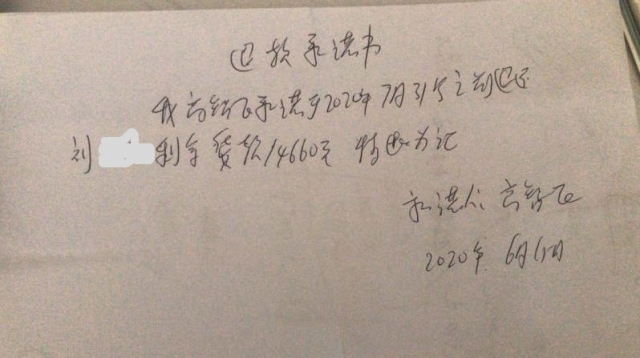為了不耽誤婚房裝修,劉先生又在居然之家選擇了其他品牌的衛(wèi)浴,并向高經(jīng)理提出退回未付貨的14660元貨款。但高經(jīng)理表示最近手里沒錢,不過,他答應(yīng)劉先生,在7月31日前會(huì)全部退還,并且當(dāng)場寫了一個(gè)退款承諾書。