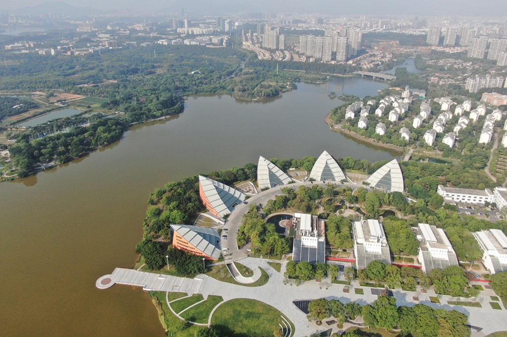 這是東莞松山湖風(fēng)景(2021年4月21日攝,無(wú)人機(jī)照片)。