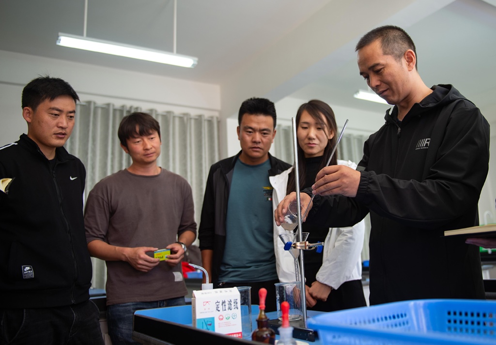 北京市援青支教教師、來(lái)自通州區(qū)陸辛莊學(xué)校的化學(xué)教師祁生貴(右一)在青海省玉樹(shù)州第四民族高級(jí)中學(xué)指導(dǎo)學(xué)校教師進(jìn)行實(shí)驗(yàn)教學(xué)(2020年8月12日攝)。新華社記者 陳鐘昊 攝