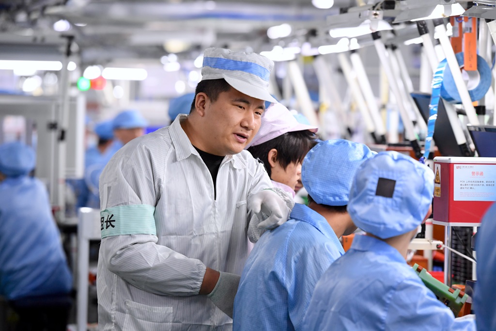 寧夏青年陳滿(mǎn)庫(kù)在飛毛腿(福建)電子有限公司車(chē)間指導(dǎo)工人操作(2021年2月3日攝)。