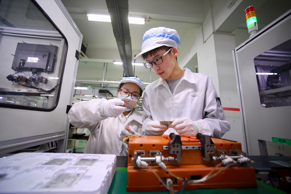 福建省飛毛腿高級(jí)技工學(xué)校三年級(jí)寧夏籍學(xué)生海鵬(右)在飛毛腿(福建)電子有限公司車(chē)間實(shí)習(xí)(2021年3月4日攝)。
