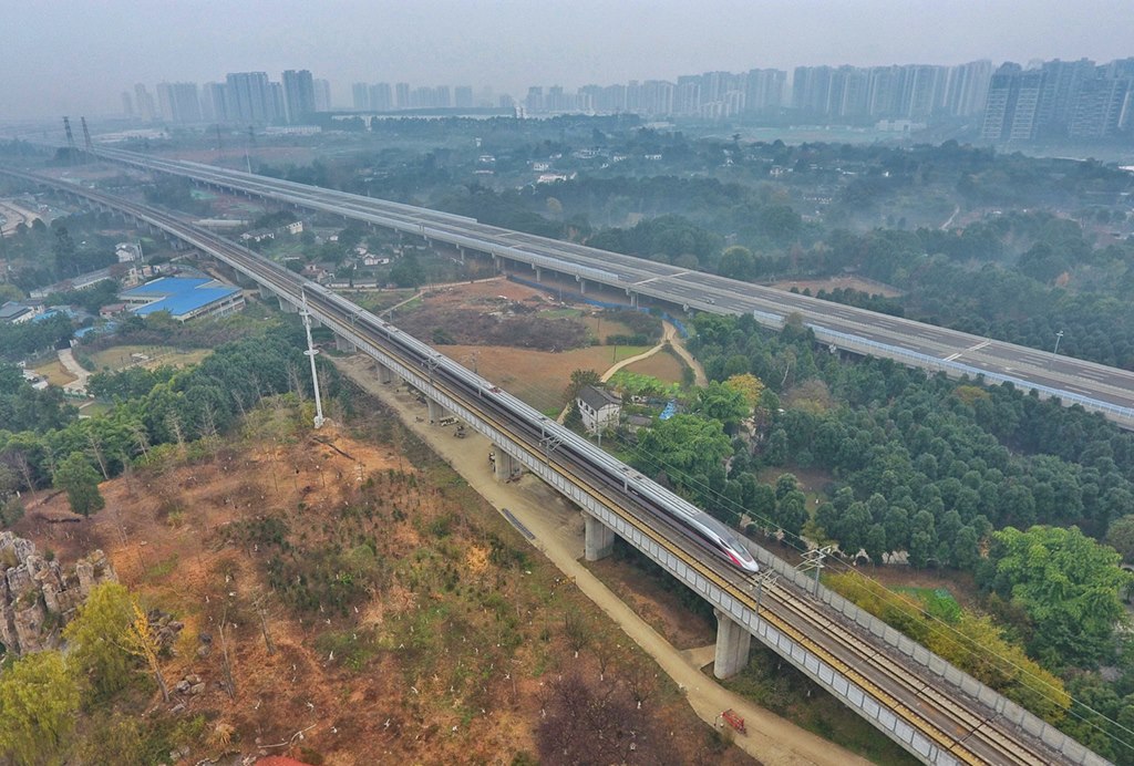 2020年12月24日,“復(fù)興號(hào)CR400AF動(dòng)車(chē)組”首次在成渝地區(qū)投入運(yùn)營(yíng),自此兩地間的高鐵通達(dá)時(shí)間縮短至62分鐘,實(shí)現(xiàn)成渝間高鐵公交化運(yùn)營(yíng)1小時(shí)通達(dá)。成渝高鐵是我國(guó)“八縱八橫”高鐵主通道沿江通道的重要組成部分,是成渝地區(qū)雙城經(jīng)濟(jì)圈城際鐵路網(wǎng)的主骨架。新華社記者 劉坤 攝