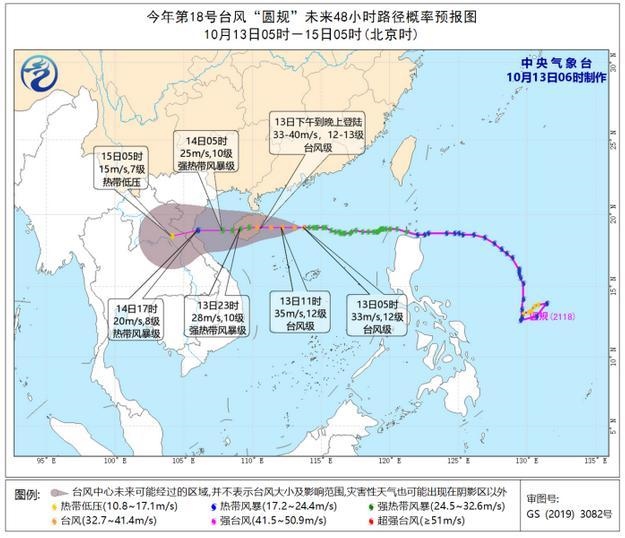 預(yù)計,“圓規(guī)”將以每小時25-30公里的速度向偏西方向移動,強度還將有所加強,將于13日下午到晚上在海南文昌到陵水一帶沿海登陸,登陸強度為臺風(fēng)級(12-13級,33-40米/秒)。登陸后,強度逐漸減弱,穿過海南島,14日凌晨移入北部灣,然后趨向越南北部。
