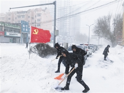 由雪花組成的白色天幕中,“迷彩服”一閃而過的綠色迸發(fā)出濃濃的生機(jī)。這些人手拿鐵鍬、掃把等工具一邊鏟雪清掃道路,一邊提醒過路行人:“小心路滑,注意安全?!睖嘏脑捳Z(yǔ)感染了兩邊的商戶,大家也紛紛加入到了“迷彩”防線,投入除雪運(yùn)動(dòng)中。