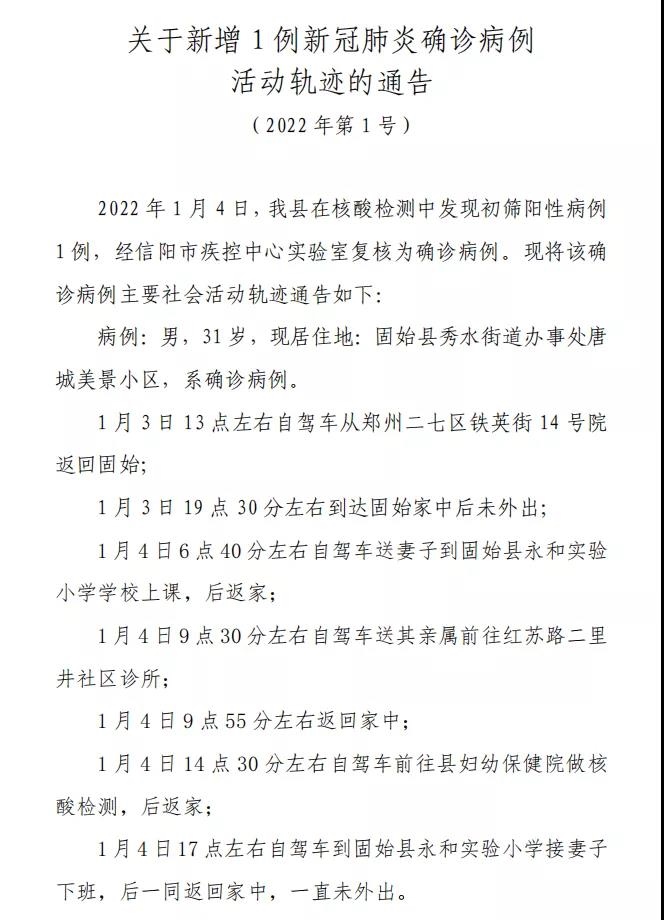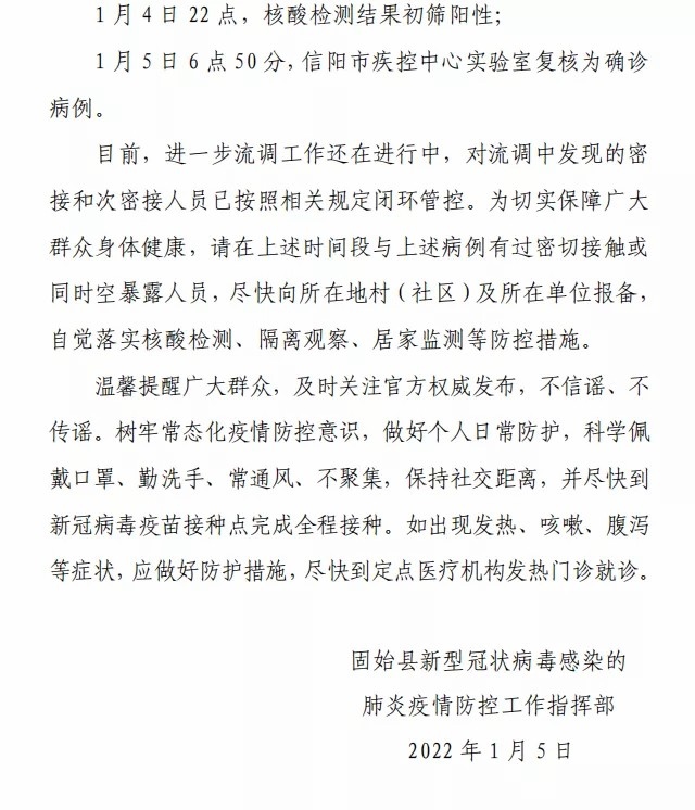 據(jù)固始縣委宣傳部微信公眾號(hào)消息,1月4日,河南固始縣在核酸檢測(cè)中發(fā)現(xiàn)初篩陽(yáng)性病例1例,經(jīng)信陽(yáng)市疾控中心實(shí)驗(yàn)室復(fù)核為確診病例。