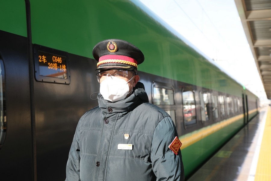 1月17日,圖為春運首日,集寧南站客運人員接發(fā)綠動列車。