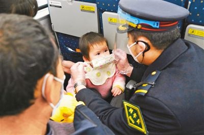 南昌客運(yùn)段“井岡山號”列車乘務(wù)人員積極開展“暖心春運(yùn)”行動,通過貼喜慶窗花、贈小旅客愛心手環(huán)和卡通口罩等一系列溫馨舉措,把溫暖送到旅客身邊。圖為乘務(wù)人員為小旅客贈送愛心口罩。