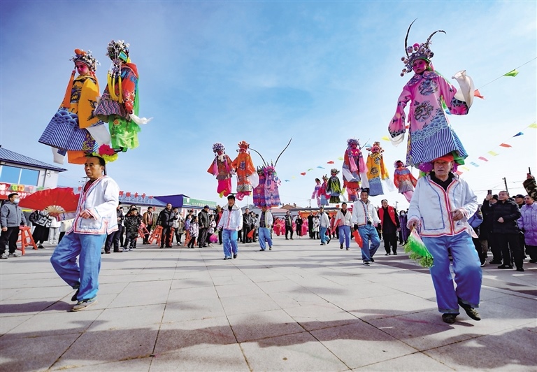 2月14日,在呼和浩特市土左旗畢克齊鎮(zhèn)臘鋪村文化廣場上,秧歌扭起來,鑼鼓敲起來,腦閣也款款擺起來。腦閣是國家級非物質(zhì)文化遺產(chǎn),扛閣的人在行走中踏著鼓點,通過身體搖動帶動架子上的孩子擺起來,極具觀賞性。(記者 鄭學(xué)良 通訊員 楊鑫 )