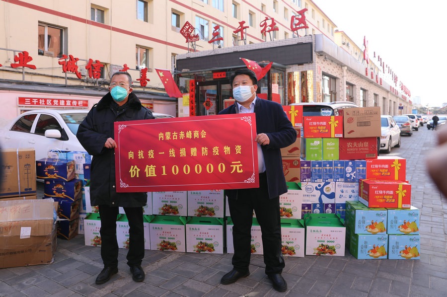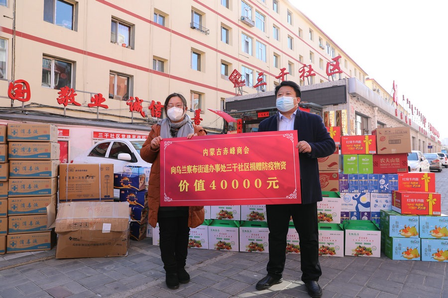 自疫情發(fā)生以來,內(nèi)蒙古赤峰商會(huì)慰問了呼和浩特市公安局賽罕區(qū)分局昭烏達(dá)路派出所,向抗疫一線公安民警表達(dá)慰問,并為他們送去第一批價(jià)值1萬元的抗疫物資;商會(huì)執(zhí)行會(huì)長(zhǎng)張學(xué)春向新城區(qū)城市管理局捐贈(zèng)5萬元防疫物資,用于一線疫情防控;商會(huì)副會(huì)長(zhǎng)單位內(nèi)蒙古乾碩防水工程有限公司分別向呼和浩特市4個(gè)社區(qū)2個(gè)衛(wèi)生院捐贈(zèng)了價(jià)值10萬元的防疫物資及生活必需品;商會(huì)聯(lián)合副秘書長(zhǎng)單位蒙影影業(yè),走進(jìn)玉泉區(qū)清泉街社區(qū),慰問抗疫一線工作人員,并為他們送去價(jià)值5000元的生活物資;商會(huì)聯(lián)合副會(huì)長(zhǎng)單位友鵬實(shí)業(yè)集團(tuán),向回民區(qū)大慶路小學(xué)、伊利健康谷、東庫(kù)街社區(qū)、呼和浩特職業(yè)學(xué)院等防控一線捐贈(zèng)價(jià)值10萬元的防疫物資。