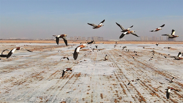 每年3—4月份,大批候鳥從南方來到鄂爾多斯市境內黃河濕地上,之后繼續(xù)向北遷飛。近幾年,隨著生態(tài)環(huán)境不斷改善,候鳥數(shù)量與種類逐年增加。圖為達拉特旗境內,遷徙候鳥正在棲息覓食。(楊耀中)