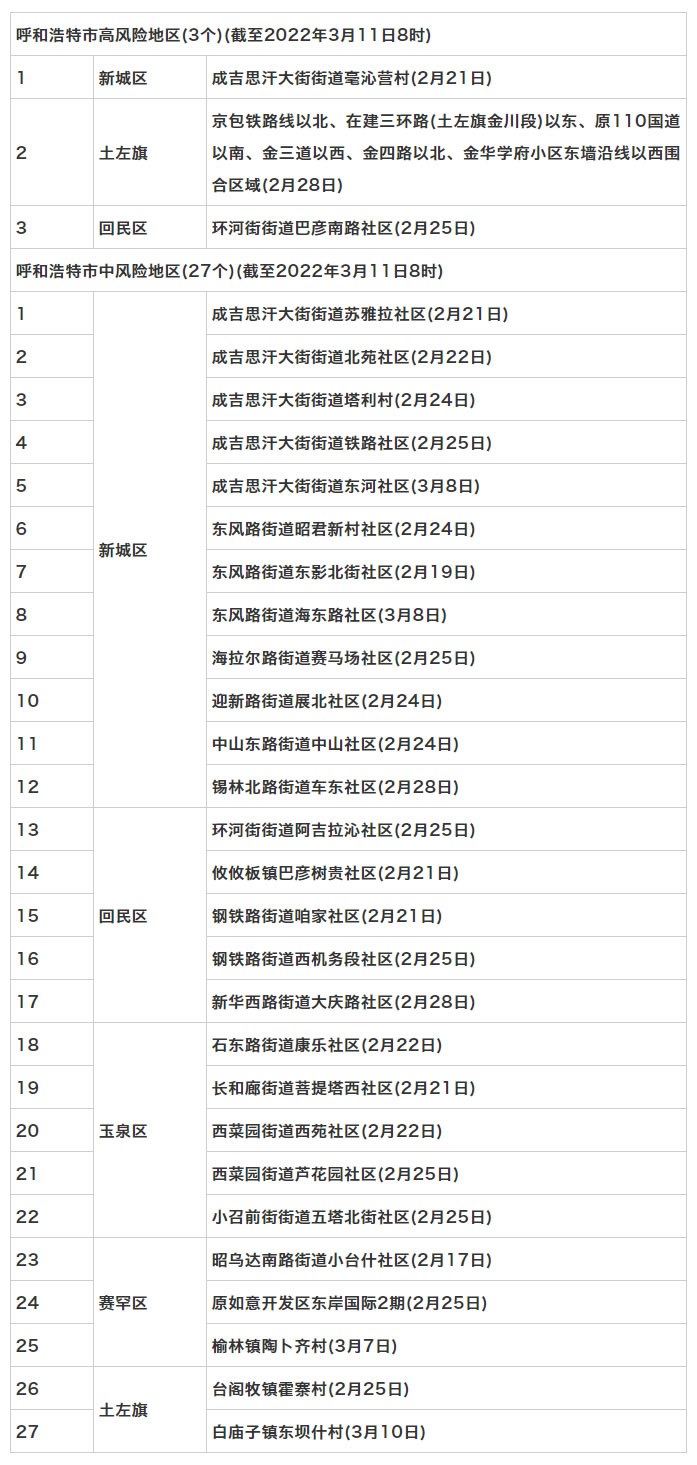 按照國務(wù)院聯(lián)防聯(lián)控機制《關(guān)于調(diào)整新冠肺炎疫情分區(qū)分級標(biāo)準(zhǔn)實施精準(zhǔn)管控措施的通知》規(guī)定,經(jīng)專家組評估,市指揮部研究決定,決定于3月11日8時起,將新城區(qū)保和少鎮(zhèn)野馬圖村,回民區(qū)環(huán)河街街道太平街社區(qū),玉泉區(qū)長和廊街道大召社區(qū)、小召前街街道建華北街社區(qū)調(diào)整為低風(fēng)險地區(qū)。其他地區(qū)風(fēng)險等級不變。